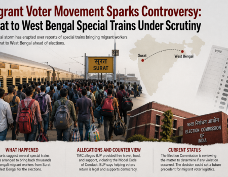 NewsPolitics Migrant Voter Movement Sparks Controversy: Surat to West Bengal Special Trains Under Scrutiny Source April 23, 2026 A fresh political controversy has emerged ahead of the West Bengal elections,...